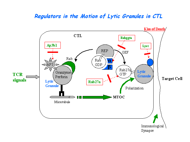 Mutations in Munc13-4 cause familial hemophagocytic lymphohistiocytosis subtype 3 (FHL3), a disease phenotypically related to GS2. Both Rab27a and Munc13-4 are highly expressed in CTLs and mast cells where they colocalize on secretory lysosomes. The region comprising the Munc13 homology domains is essential for the localization of Munc13-4 to secretory lysosomes. The GS2 mutant Rab27a (W73G) strongly reduced binding to Munc13-4, whereas the FHL3 mutant Munc13-4 (Delta 608-611) failed to bind Rab27a. Overexpression of Munc13-4 enhanced degranulation of secretory lysosomes in mast cells, showing that it has a positive regulatory role in secretory lysosome fusion. This observations suggest that the secretion defects seen in GS2 and FHL3 have a common origin, and that the Rab27a/Munc13-4 complex may be an essential regulator of secretory granule fusion with the plasma membrane in hematopoietic cells. Mutations in either of the two genes prevent formation of this complex and abolish secretion (Neeft, et al). Both Slp1 and Slp2-a are expressed and interact with Rab27a in CTL, by forming part of a docking complex, capturing secretory lysosomes at the immunological synapse,contributing to secretory lysosome exocytosis (Holt, et al). The hematopoietic form of Slp2a (Slp2a-hem) is a specific effector of the active form of Rab27a. Rab27a recruits Slp2a-hem on vesicular structures in peripheral CTLs. Following CTL-target cell conjugate formation, the Slp2a-hem/Rab27a complex colocalizes with perforin-containing granules at the immunologic synapse (Menasche, et al (2008)).